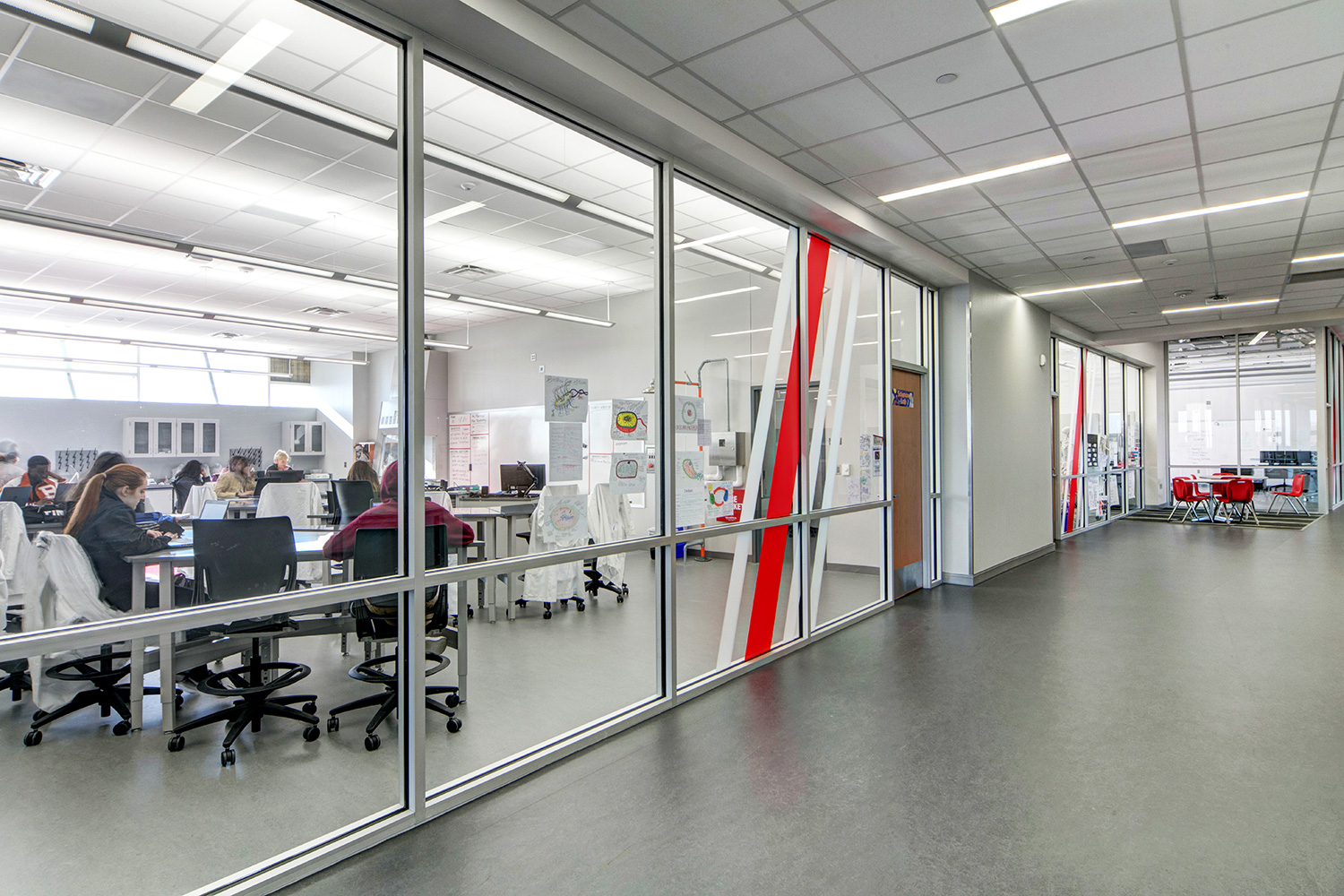 Inside the CTC, VLK Architect’s specified Tubelite’s INT45 Interior Flush Glaze Framing system. The system’s perimeter trim members were pre-applied on one side of the frame opening for fast, simple installation by Pierce Riverside.