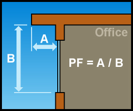 For climate zones 1–5, the vertical fenestration on the west, south and east shall be shaded by permanent projections that have an area-weighted average Projection Factor (PF) of not less than 0.50. The building is allowed to be rotated up to 45 degrees to the nearest cardinal orientation for purposes of calculations and showing compliance. The PF is the ratio of the distance the overhang projects from the window surface to its height above the sill of the window it shades.