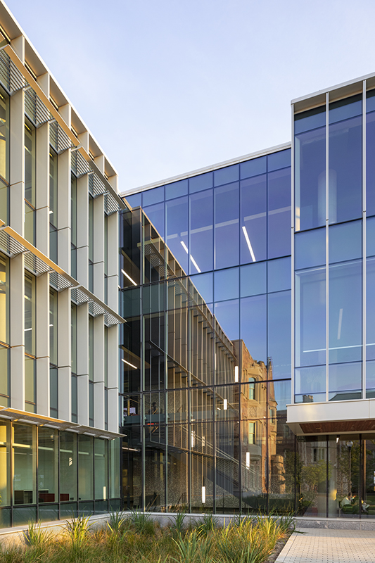 McKelvey Hall’s three-story structure respects WashU’s architectural legacy by incorporating Missouri red granite and limestone masonry. Bridging the Collegiate Gothic style reminiscent of European universities and carrying the campus forward, the modern aluminum-framed glass façade serves as a dramatic window into the school’s innovative, computational research and connects students with views of the surrounding campus.