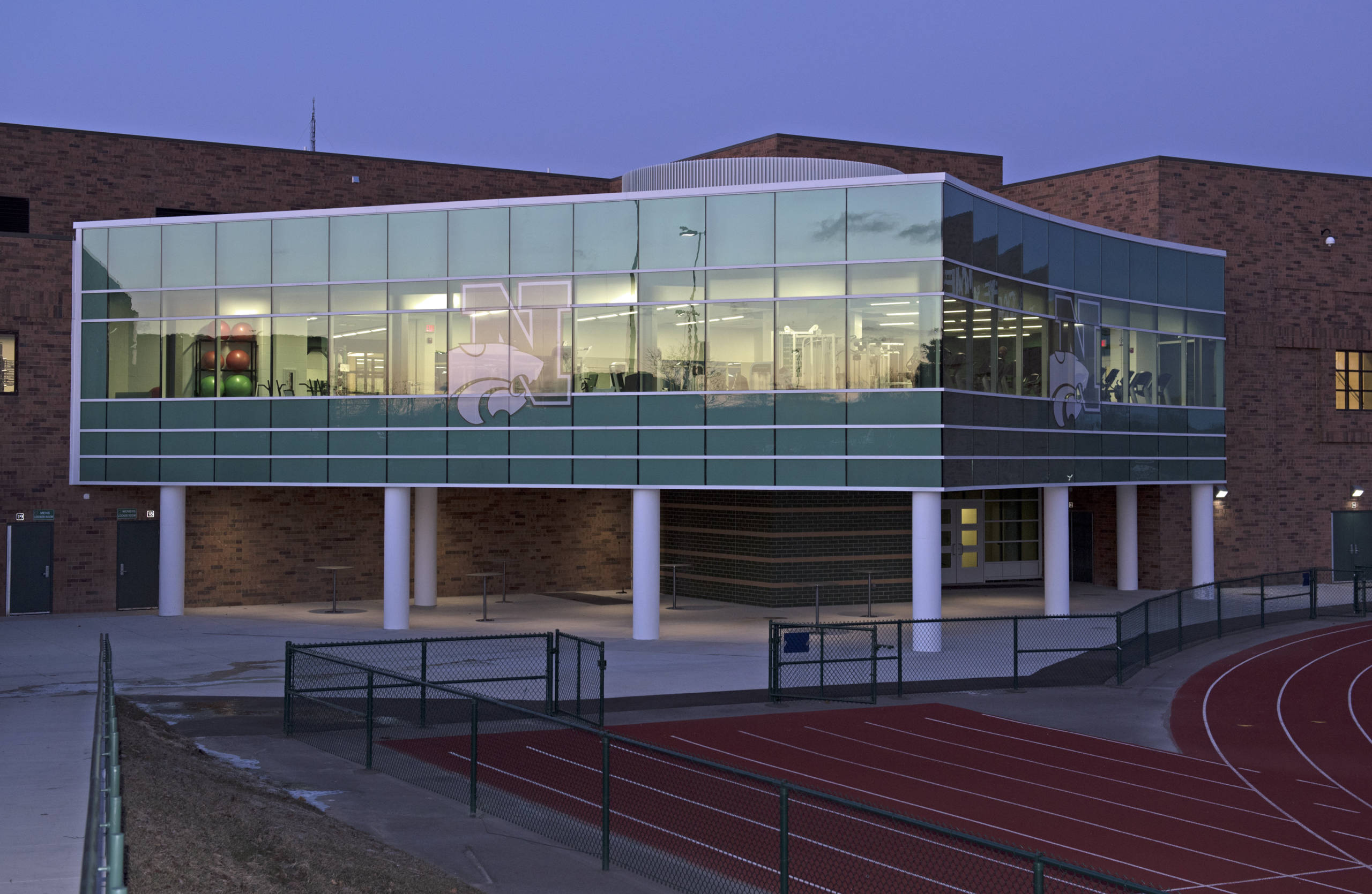 Photo by: John HeiderMichigan’s Novi High School‘s new $3 million fitness center replaces an outdated weight room that served only a few of the 2,000 students. Now a modern facility, it welcomes everyone, including 30 varsity sports teams and 10 physical education classes per semester. Featuring a glass and metal curtainwall by Tubelite Inc., the new fitness center offers natural light and views overlooking the north end zone at the school’s Wildcats Stadium.