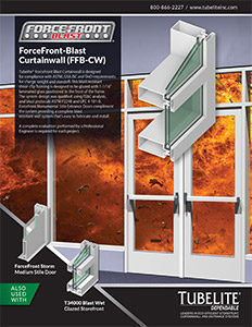 Tubelite ForceFront Blast Curtainwall is designed for compliance with ASTM, GSA ISC and DoD requirements for charge weight and standoff. This blast resistant shear-clip framing is designed to be glazed with 1-1/16″ laminated glass positioned to the front of the frame. The system design was qualified using TE&C analysis, and blast protocols ASTM F2248 and UFC 4-101-0. Forcefront Monumental Stile Entrance Doors compliment the system providing a complete blast resistant wall system that’s easy to fabricate and install.